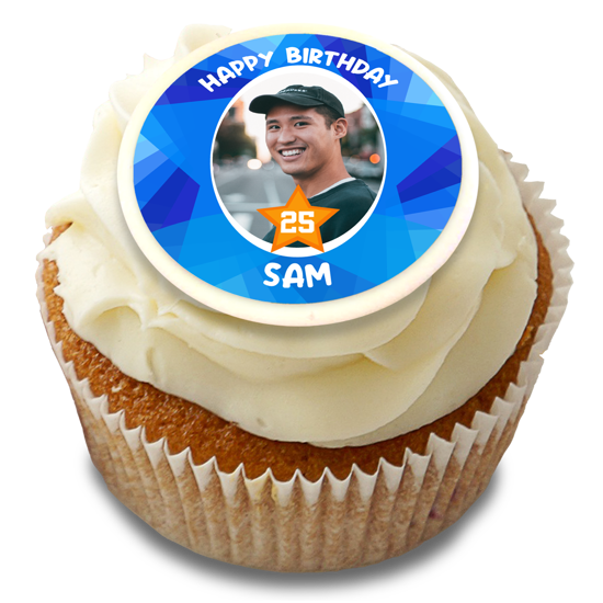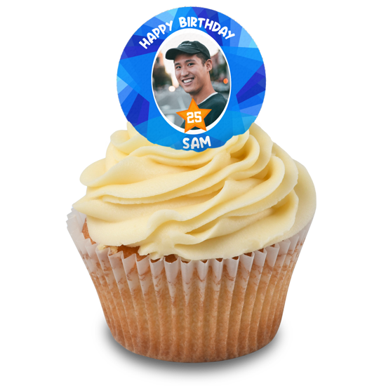 Happy birthday blue coloured funky star border custom age for him photo upload Edible Cupcake Topper