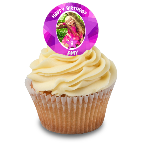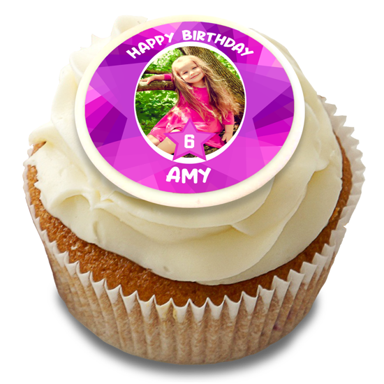 Happy birthday pink coloured funky star border custom age for girls photo upload Edible Cupcake Topper