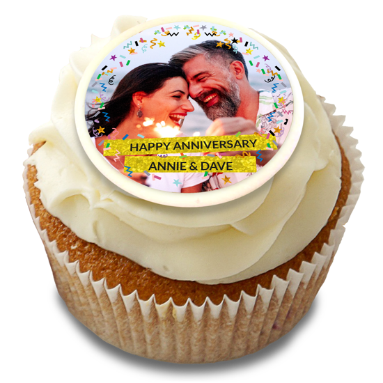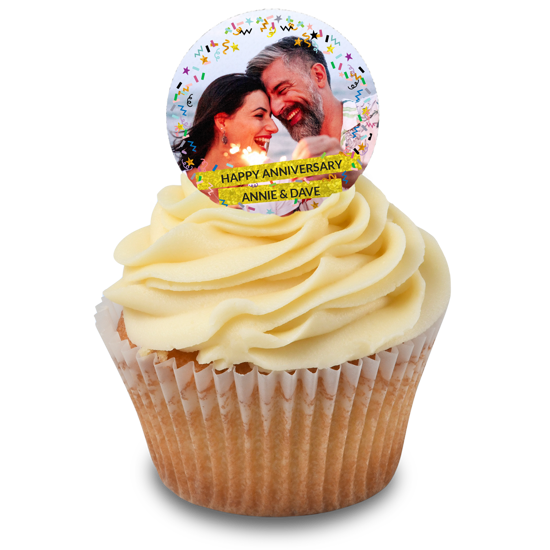 Happy anniversary sparkly gold glitter & coloured confetti photo upload Edible Cupcake Topper