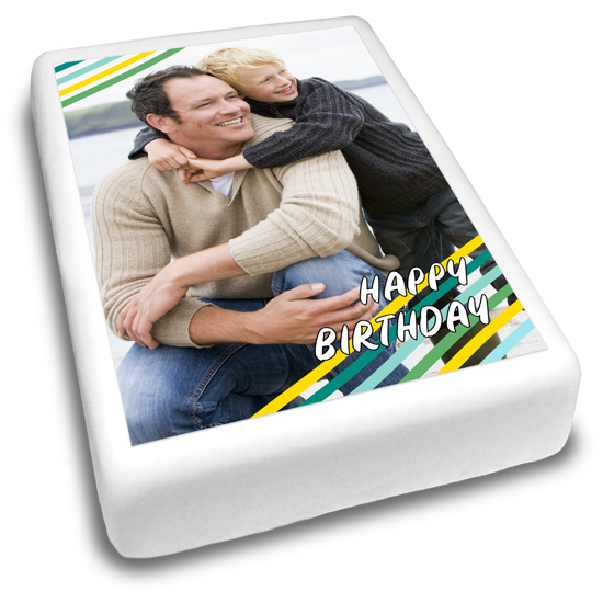 Looking for colourful personalised cake decorations for his birthday celebrations? Our happy birthday green, blue & yellow line border topper is the perfect way to make him smile! Upload his favourite photo to this birthday cake topper in seconds and finish off your topper with a custom message! Simply pick a photo from your phone, laptop or social feeds to add your custom topper and position it with our easy editor!