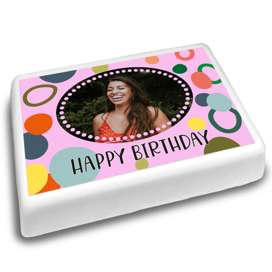 Brighten her birthday with our multi-colour abstract circle pink border topper! This bright and creative design is the perfect way to showcase your favourite photo of the birthday queen! Personalise this birthday cake topper with your chosen photo! Simply pick a photo from your phone, laptop or social feeds to add your custom topper and position it with our easy editor! Finish off your topper with a custom message!