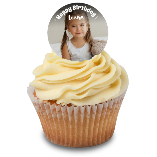 Happy birthday white handwritten text for girls photo upload Edible Cupcake Topper