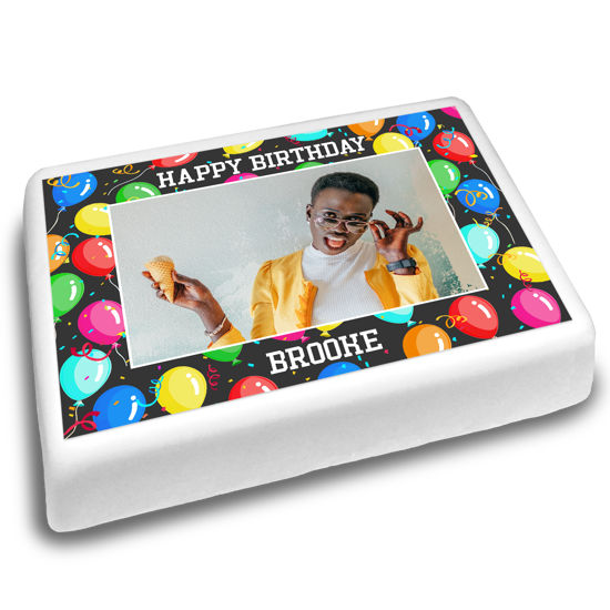 Looking for dancing colourful balloons style personalised cake decorations for her birthday celebrations? Our happy birthday dancing colourful balloons border topper is the perfect way to make her smile! Upload her favourite photo to this birthday cake topper in seconds! Simply, pick a photo from your phone, laptop or social feeds to add your custom topper and position it with our easy editor! Finish your topper by adding a custom message!