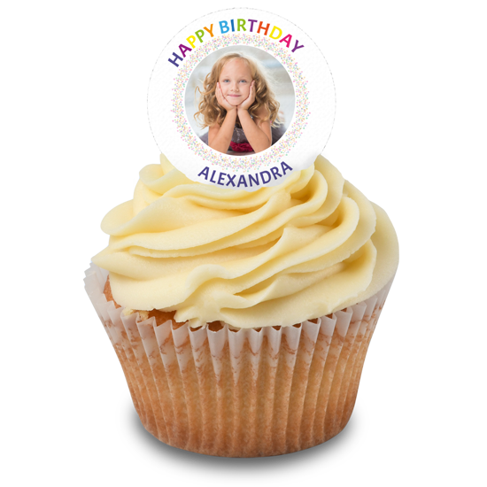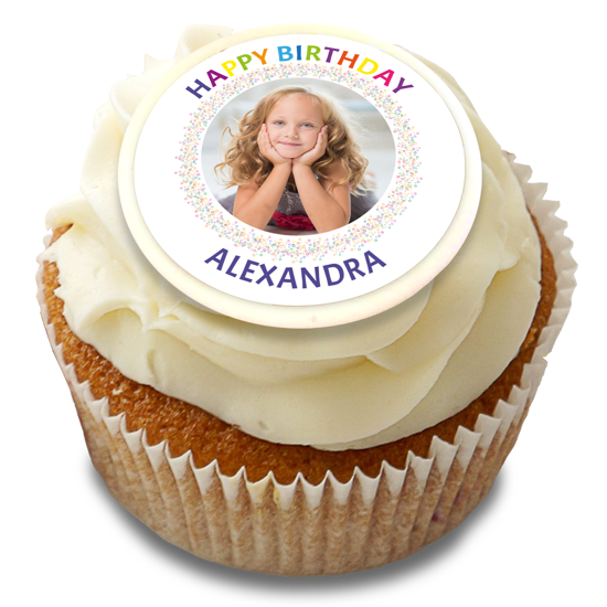 Looking for colourful personalised cake decorations for a girls birthday party? Our happy birthday rainbow sprinkle border topper is the perfect way to make her smile! Upload her favourite photo to this birthday cake topper in seconds! Simply, pick a photo from your phone, laptop or social feeds to add your custom topper and position it with our easy editor!