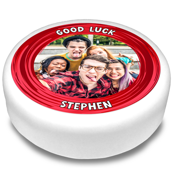Wish them good luck with our good luck red swirl border topper! This edible topper is a great way to wish them good luck on their next adventure! Easily personalise using our topper editor and upload your chosen photo for a personal touch!