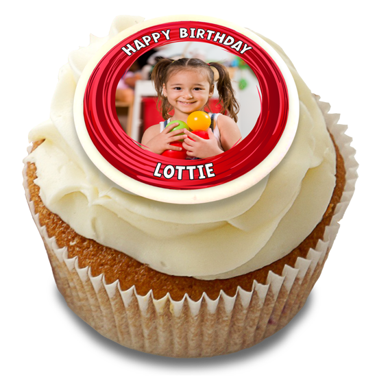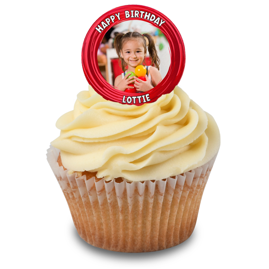Happy birthday red swirl border for girls photo upload Edible Cupcake Topper