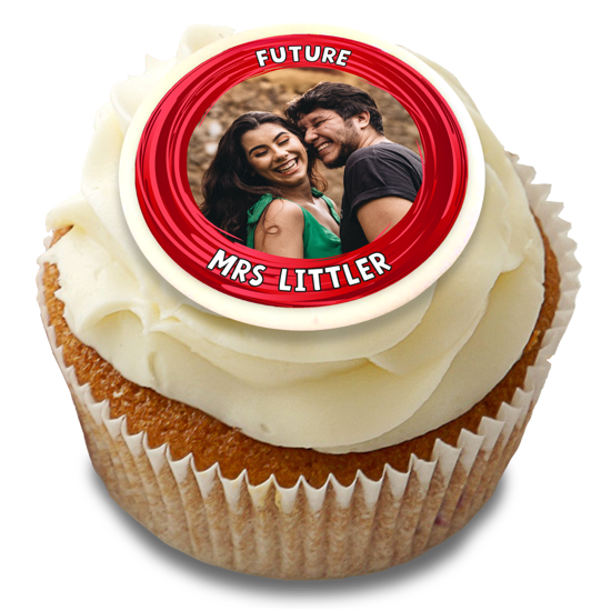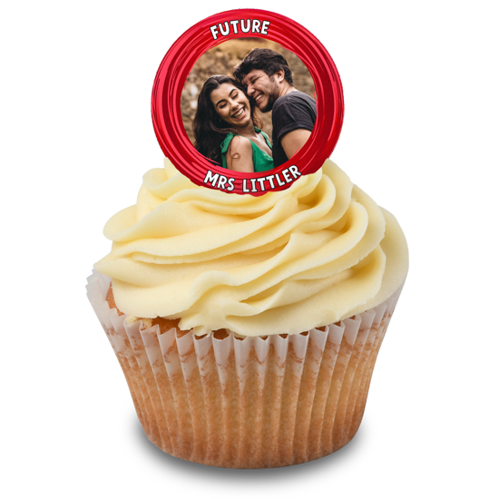 Surprise the hen on her special do! Personalise our hen do red swirl border topper with the most fabulous photo of the new bride-to-be! These custom edible toppers are the perfect party fuel for a group of girlfriends! The perfect way to decorate your hen do cupcakes and share photos from your special friendships. Easily pick a photo from your phone, laptop or social feeds to add your custom topper and position it with our easy editor!