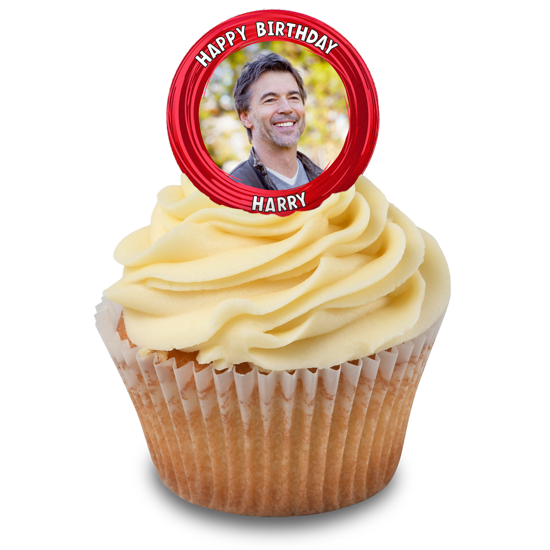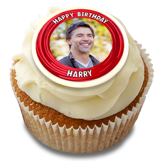 Happy birthday red swirl border for him photo upload Edible Cupcake Topper
