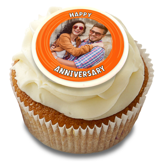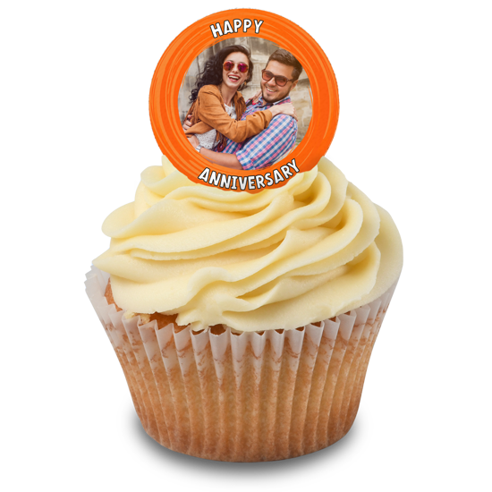 Happy anniversary orange swirl border photo upload Edible Cupcake Topper