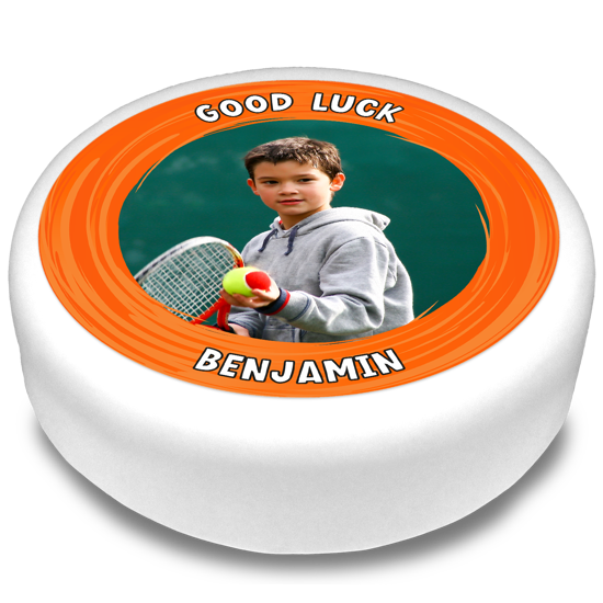 Good luck orange swirl border photo upload Sponge Cake Topper