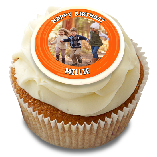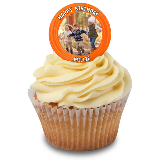 Happy birthday orange swirl border for girls photo upload photo upload Edible Cupcake Topper