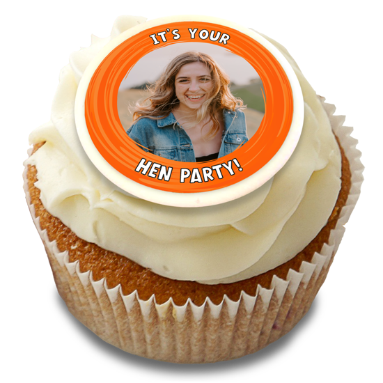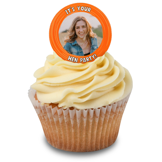 Surprise the hen on her special do! Personalise our hen do orange swirl border topper with the most fabulous photo of the new bride-to-be! These custom edible toppers are the perfect party fuel for a group of girlfriends! The perfect way to decorate your hen do cupcakes and share photos from your special friendships. Easily pick a photo from your phone, laptop or social feeds to add your custom topper and position it with our easy editor!