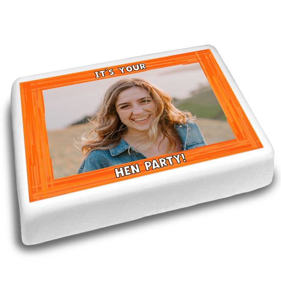 Surprise the hen on her special do! Personalise our hen do orange swirl border topper with the most fabulous photo of the new bride-to-be! These custom edible toppers are the perfect party fuel for a group of girlfriends! The perfect way to decorate your hen do cupcakes and share photos from your special friendships. Easily pick a photo from your phone, laptop or social feeds to add your custom topper and position it with our easy editor!