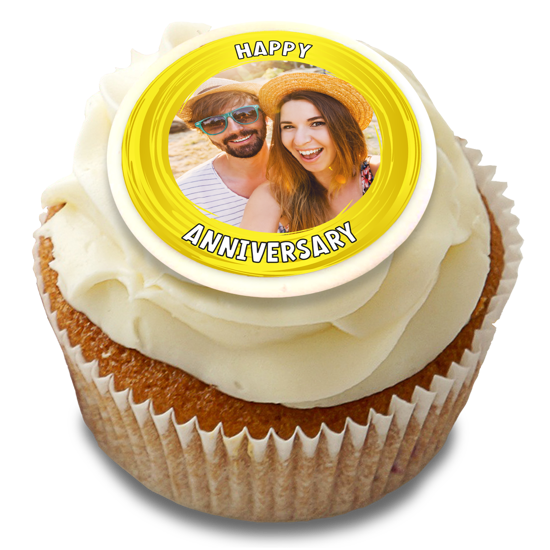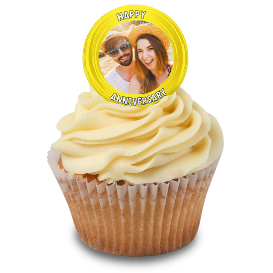 Happy anniversary yellow swirl border photo upload Edible Cupcake Topper