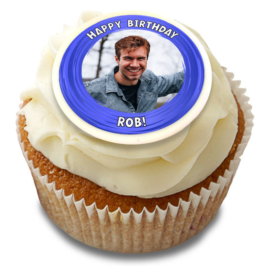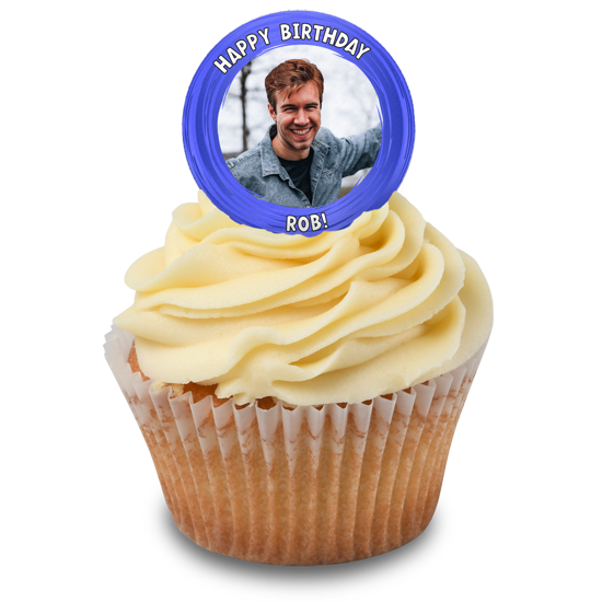 Happy birthday dark blue swirl border for him photo upload Edible Cupcake Topper