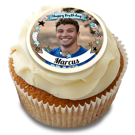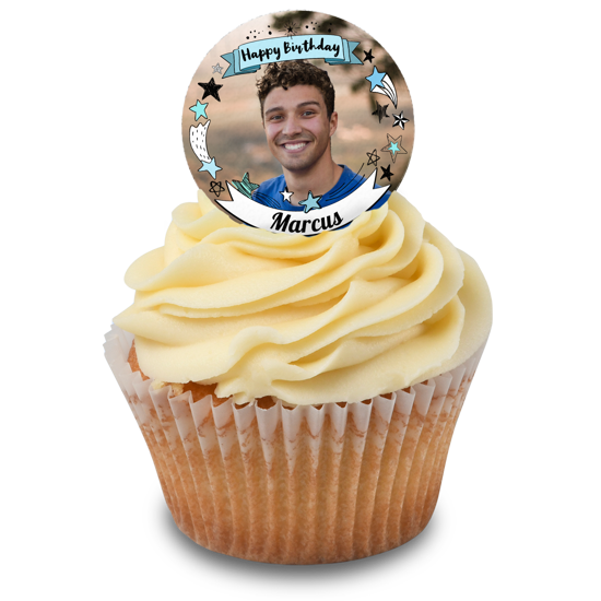 Illustrated blue stars border 'happy birthday' banner for him photo upload Edible Cupcake Topper