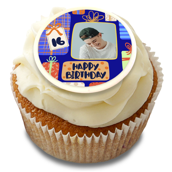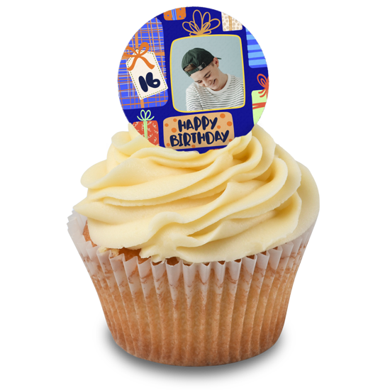 Happy birthday blue multi-coloured presents for him photo upload Edible Cupcake Topper
