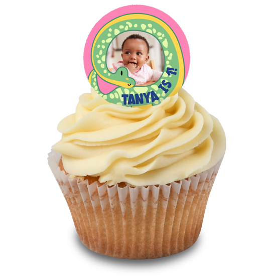 Birthday pink and green cute dinosaur for girls photo upload Edible Cupcake Topper