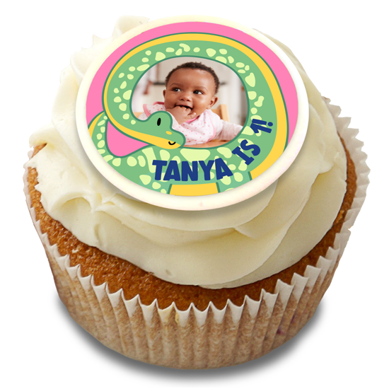 Add some cute-ness to her birthday with our adorable birthday pink and green cute dinosaur topper! Use our handy topper to add your own photo of your little one to this design. Customise your topper with her name and age to the design to make it extra special!