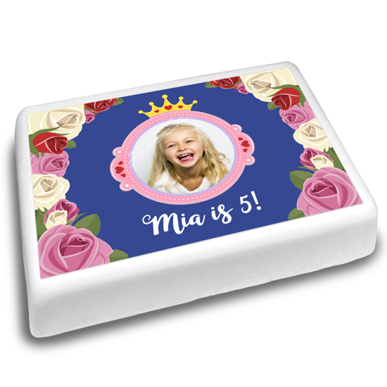 Party like a princess with our princess crown blue rose birthday border topper! This sweet princess border topper is the perfect finishing touch to a princess themed birthday cake! Upload your favourite photo of the birthday girl using our handy topper editor and customise your topper with her name and age.