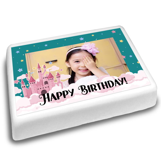Throw a birthday ball fit for a princess with this princess castle clouds and stars birthday border topper! This sweet design features a fairytale princess castle nestled in candy floss clouds! Upload your favourite photo of the birthday girl using our handy topper editor and customise your topper with her name.