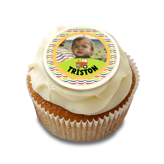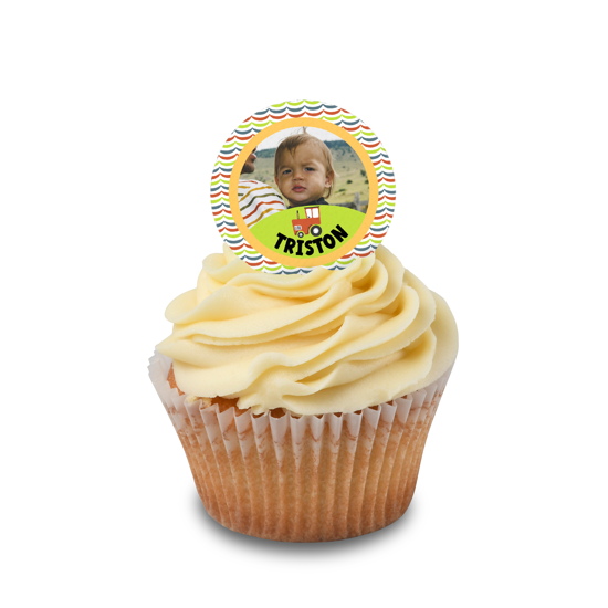 Birthday colourful retro farm tractor frame for boys photo upload Edible Cupcake Topper