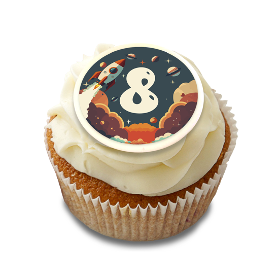 Birthday retro graphics space rockets and planets for boys custom text Edible Cupcake Topper