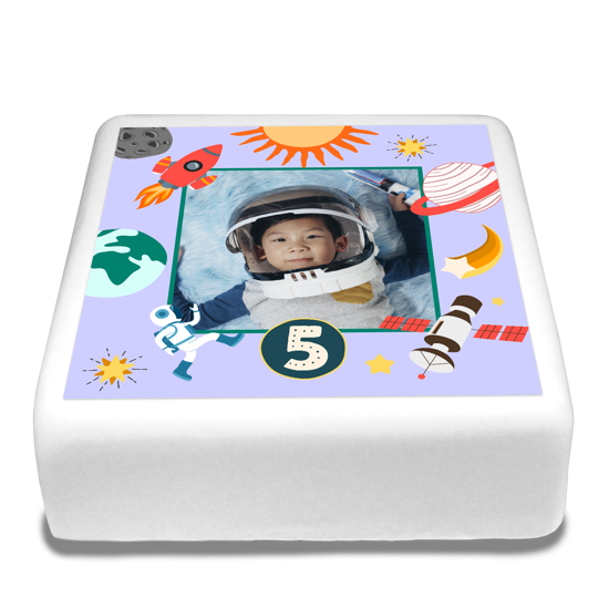 Shoot into space with our birthday purple space astronaut illustration frame topper! Upload a photo of the birthday boy to this space-themed frame topper! Customise this design by adding your age with our handy topper editor.
