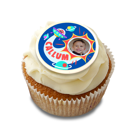 Birthday colourful alien spaceship for boys photo upload Edible Cupcake Topper