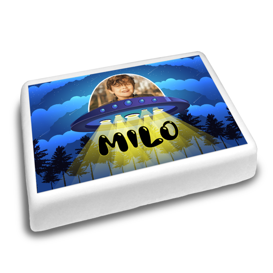 Bring some extra-terrastrial fun to your birthday party with our birthday landing flying saucer with space aliens topper! Customise this space themed topper by uploading a photo of the birthday boy to the spaceship and add a name using our handy topper editor.
