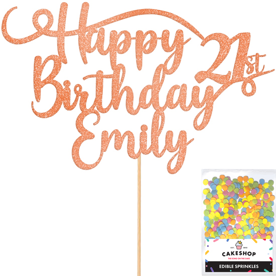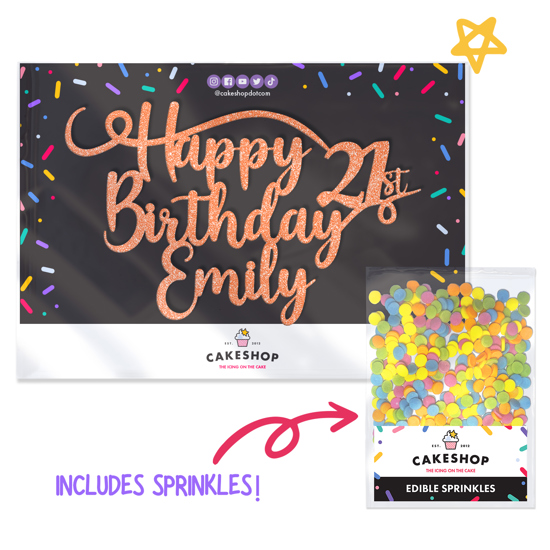Double sided, super sparkly personalisable glitter cake topper, choose from 14 colour options, add an age and any name to our best seller using our easy editor! Cakeshop glitter toppers come with a 25g pack of edible sprinkles to elevate your bake even further, see 'What's Included' section below for full details and ingredients.