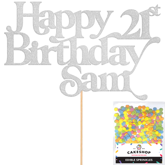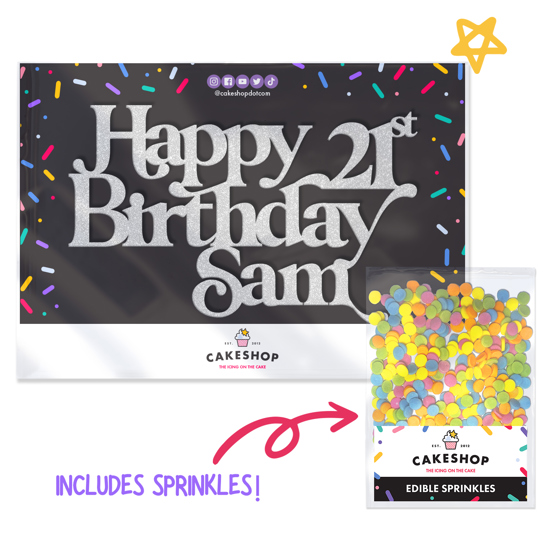 Keep it classy with our swirl cursive text happy birthday topper. Add an elegant touch to your birthday cake with this classic glitter topper. Fully customise your cake topper with any age and name to tailor it the occasion and pick any of our 14 gorgeous double-sided glitter shades! Cakeshop glitter toppers come with a 25g pack of edible sprinkles to elevate your bake even further, see 'What's Included' section below for full details and ingredients.
