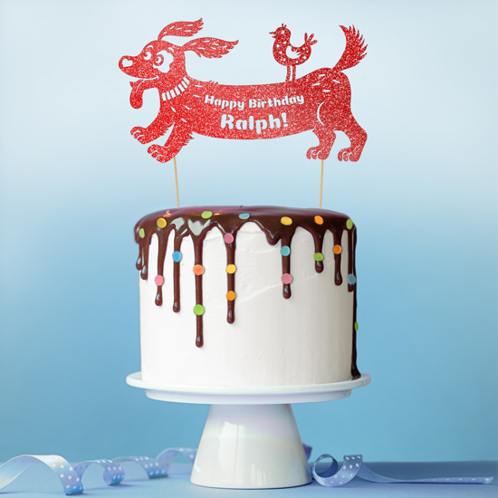 Fluffy pet sausage dog happy birthday custom name Glitter Topper