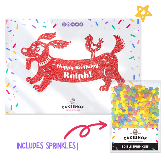 Calling all dog lover's - we have a paw-some topper for you! This cute sausage dog birthday topper is perfect for any puppy pet owner! Customise with any name and our designers will do the rest to make your topper look amazing. Want a specific colour? No problem, simply pick from our 14 gorgeous double sided glitter shades. Cakeshop glitter toppers come with a 25g pack of edible sprinkles to elevate your bake even further, see 'What's Included' section below for full details and ingredients.