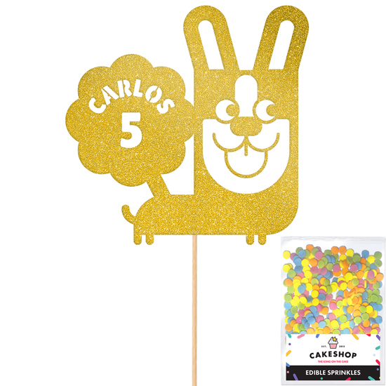 This adorable small cute dog custom glitter topper is the best companion for a dog lover's birthday cake! Customise your topper with any age and name and pick your chosen colour from our 14 glitter shades! Cakeshop glitter toppers come with a 25g pack of edible sprinkles to elevate your bake even further, see 'What's Included' section below for full details and ingredients.