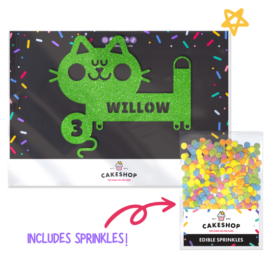 Add some extra cuteness to their birthday cake with our adorable cartoon birthday cat glitter topper! Customise this topper with any name and age using our easy editor and choose a colour from our selection of 14 glitter shades. Cakeshop glitter toppers come with a 25g pack of edible sprinkles to elevate your bake even further, see 'What's Included' section below for full details and ingredients.