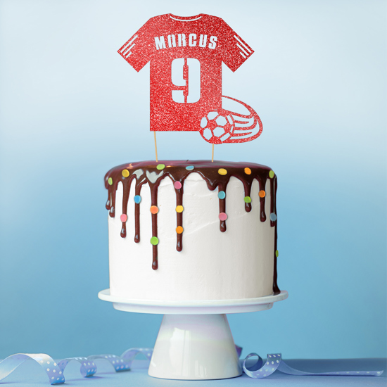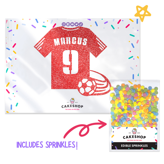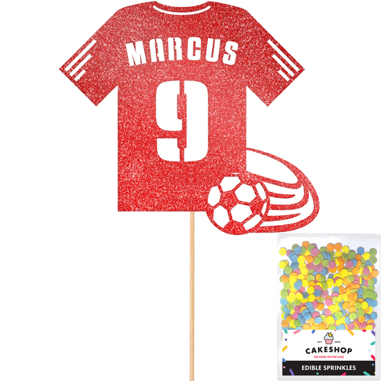 Create a custom birthday football team shirt glitter topper for the footie fan in your life! This best-selling design is fully customisable, use our easy editor to add any name and age to this sporty design. Choose their favourite team's colour from our 14 double-sided glitter shades! Cakeshop glitter toppers come with a 25g pack of edible sprinkles to elevate your bake even further, see 'What's Included' section below for full details and ingredients.
