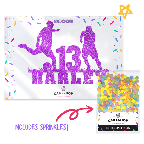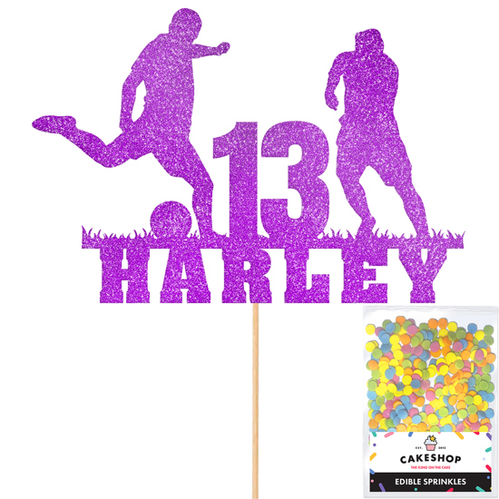 This sporty action shot glitter topper is ideal for any football obsessive! Perfect for football birthday parties! This best-selling design is fully customisable, use our easy editor to add any name and age and choose their favourite team's colour from our 14 double-sided glitter shades! Cakeshop glitter toppers come with a 25g pack of edible sprinkles to elevate your bake even further, see 'What's Included' section below for full details and ingredients.