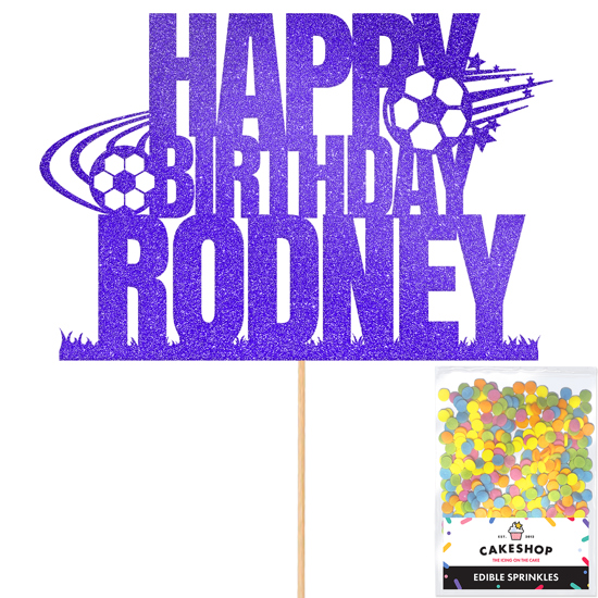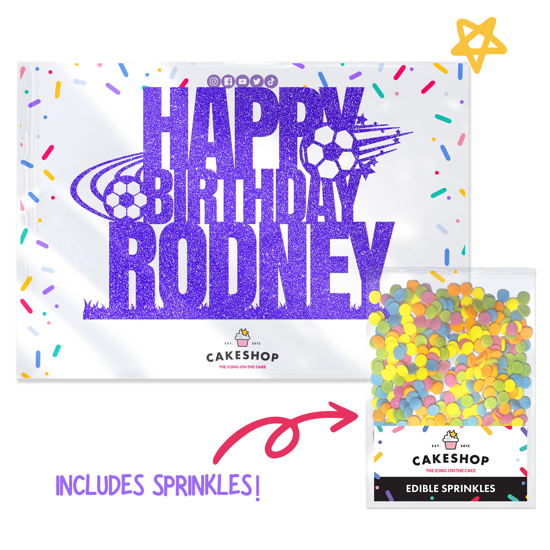 Make any football fan's day with this happy birthday football design glitter topper! Customise this sporty cake topper with our easy editor to add any name! You can also choose their favourite football team's colour from our 14 double-sided glitter shades! Cakeshop glitter toppers come with a 25g pack of edible sprinkles to elevate your bake even further, see 'What's Included' section below for full details and ingredients.