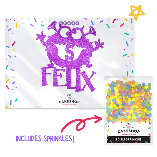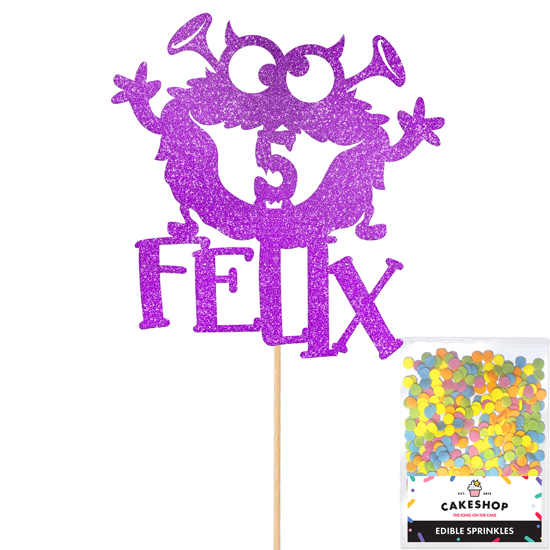 Make a little monster's birthday super special with our scary goofy fluffy monster birthday glitter topper! Personalise your custom monster cake topper with any age or name! Pick your favourite shade from our selection of 14 glitter colours! Cakeshop glitter toppers come with a 25g pack of edible sprinkles to elevate your bake even further, see 'What's Included' section below for full details and ingredients.
