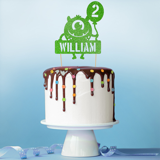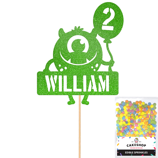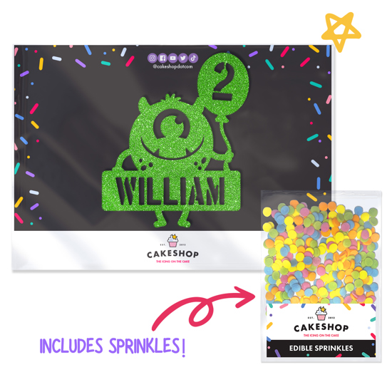 Make a little monster's birthday super special with our friendly round monster with birthday balloon glitter topper! Personalise your custom monster cake topper with any age or name! Pick your favourite shade from our selection of 14 glitter colours! Cakeshop glitter toppers come with a 25g pack of edible sprinkles to elevate your bake even further, see 'What's Included' section below for full details and ingredients.