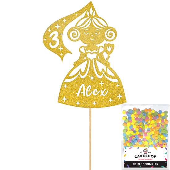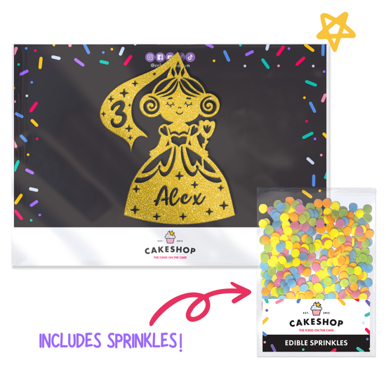 Make your birthday cake magical with this adorable fairy princess dress birthday glitter topper! Covered in tiny stars, this fairy-tale design works perfectly with our 14 super sparkly glitter shades! Perfect for a princess birthday party. Customise your princess cake decoration by adding any age and name! Cakeshop glitter toppers come with a 25g pack of edible sprinkles to elevate your bake even further, see 'What's Included' section below for full details and ingredients.