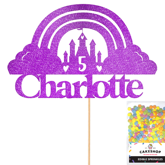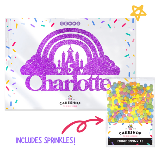 Transform your birthday party into a fairy-tale kingdom with our enchanted rainbow magical kingdom birthday princess glitter topper! Perfect for throwing a princess birthday party! Explore our 14 super sparkly double-sided glitter shades and customise you topper with any age and name! Cakeshop glitter toppers come with a 25g pack of edible sprinkles to elevate your bake even further, see 'What's Included' section below for full details and ingredients.