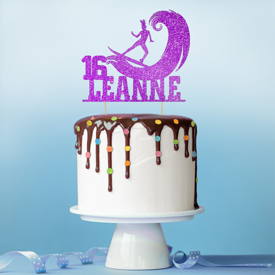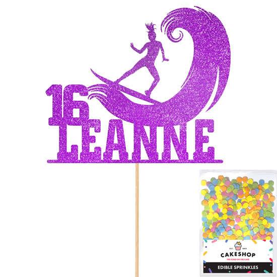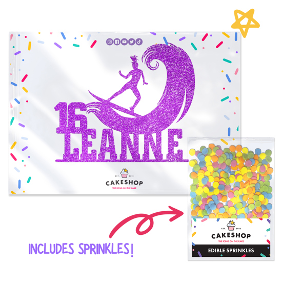 Surfs up! Make her day with this epic surfing waves for her birthday glitter topper! Bring the waves to her birthday celebration! Personalise her custom topper by adding her age and name using our easy editor. Choose from our 14 double-sided glitter shades! Cakeshop glitter toppers come with a 25g pack of edible sprinkles to elevate your bake even further, see 'What's Included' section below for full details and ingredients.