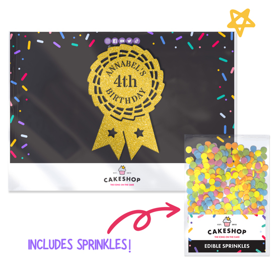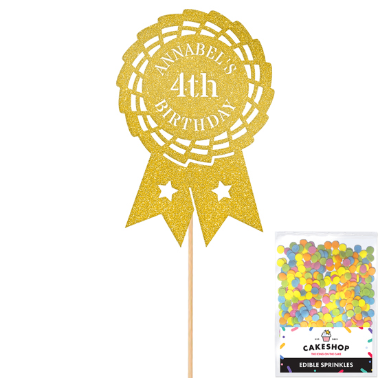 Our horse riding rosette award birthday glitter topper is perfect for horse riders! Add any name and age to your custom equestrian themed cake topper using our easy editor and pick from our 14 double-sided glitter shades. Cakeshop glitter toppers come with a 25g pack of edible sprinkles to elevate your bake even further, see 'What's Included' section below for full details and ingredients.